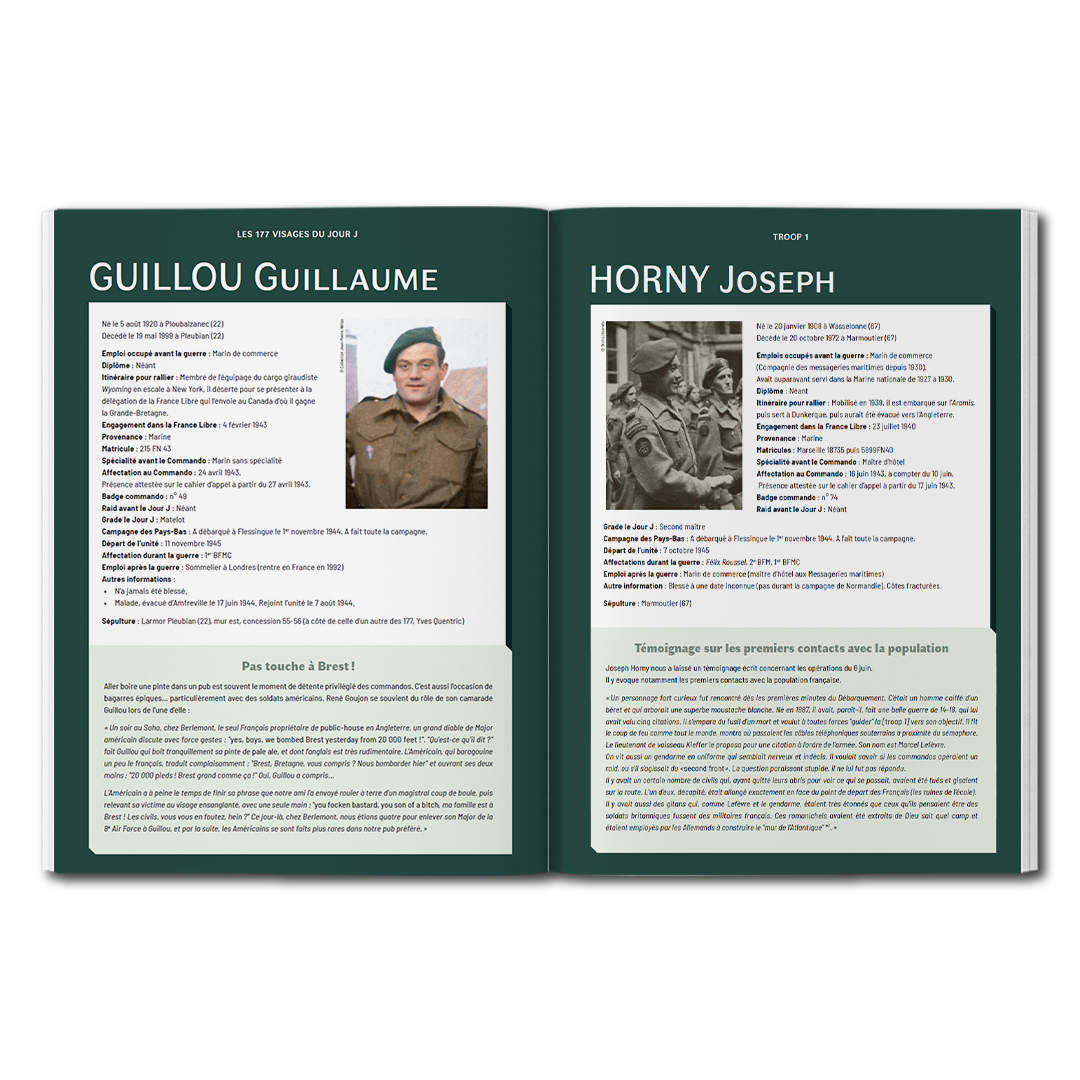 Benjamin Massieu et Jean-Christophe Rouxel se sont lancés dans un extraordinaire défi : retrouver les visages de ces 177 commandos français et présenter leurs parcours. D’archives officielles en greniers de particuliers, ils ont pu, aidés par de nombreux passionnés et des familles de commandos, découvrir des itinéraires hors du commun. En 2023, au terme de neuf années de recherches, ils ont retrouvé le dernier de ces visages !